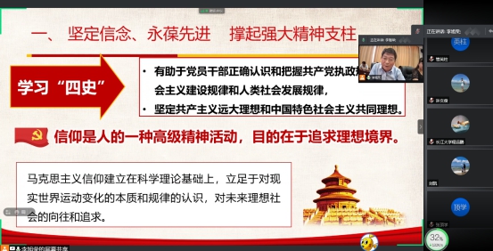 623日下午,公司在石油科技大楼B113室召开全院教职工大会,经理江厚顺以“学习‘四史’ 汲取智慧”为题为全院教职工了讲授了一堂形势与政策课,在外出差教师在腾讯会议平台线上同步学习。
