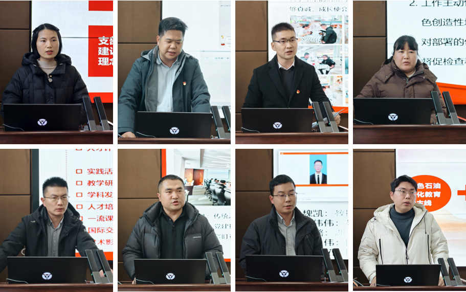 全国党建工作样板支部、油气田开发工程系教工党支部书记许文俊展示了校外党建联建共创活动、“三位一体”党团共建机制和“三全育人”实践成果;油气储运工程系教工党支部书记边江详细介绍了支部“我为师生办实事”实践活动开展过程和成果,切实将党建成果切实转化为育人实效;油气井工程系师生联合党支部书记余义兵汇报了支部标准化规范化建设以及支部党建引领系所教学创新和科学研究情况;机关教工党支部书记杨小玉重点汇报了“党员示范岗”品牌活动开展实效,以及机关党建与“公司目标考核管理办法”等业务工作融合特色。油气田化学工程系教工党支部书记孙珊珊、海工系和实验中心联合教工党支部书记徐鹏、新能源科学与工程系教工党支部书记汪维伟、员工党支部书记代表韩清越分别围绕支部政治建设、组织建设、党员教育管理、服务师生群众、推动中心工作融合等核心职责进行了汇报。