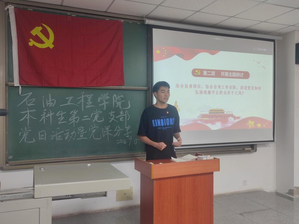 首先,同志们集体诵读党章并学习了党的创新理论,观看了习近平在湖北武汉考察的视频,充分意识到科技的命脉牢牢掌握在自己手中的重要性。随后,大会开展主题研讨,徐慧玲同志,颜博同志和王晓庆同志结合其自身学干岗位和工作实际与大家交流对党员如何弘扬清廉守正担当实干之风的看法。会议最后一项,进行了党课“我”来讲分享会,主要由龚焕文等五位同志,分别以“家风建设”、“两学一做,争做合格党员”、“对党忠诚”、“延安精神”、“为中华之崛起而读书”为主题进行分享。