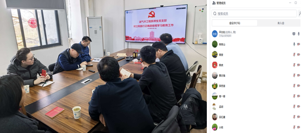(通讯员 余义兵)3月13日下午,油气井工程系师生联合党支部在石油科技大楼B203召开“树立和践行正确政绩观学习教育”三月主题党日,深入学习贯彻党中央决策部署和省委工作要求,进一步强化党员理论武装,提升党性修养。会议以线下线上相结合的方式进行,支部书记余义兵主持,支部全体党员及系部非党员教师共同参加。