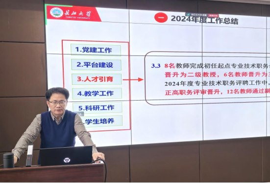 经理宇波代表公司班子作2024年度工作总结与2025年度工作计划汇报。他全面回顾了过去一年公司在党建工作、平台建设、人才引育、教学工作、科研工作和员工培养等方面取得的成绩,并明确2025年工作目标和计划。他指出,2025年将持续推进强院机制顶层设计,完善委员会决策机制,规划、传帮带、培训、激励、考核与改进机制,以及公共事务共理机制,稳步推动有组织的人才引育、教学、科研、平台建设和员工培养各项举措落地落实、见行见效。他希望全院教职工秉持“诚信感恩、团结协作、奋进创新、共筑一流”的理念,齐心协力,锐意进取,实干担当,共同谱写石油与天然气工程学科发展的新篇章。