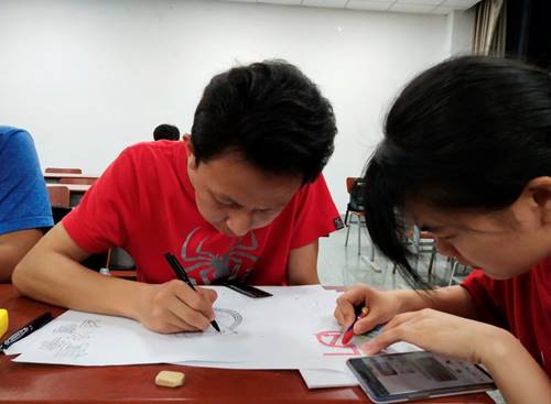 随后每个小组的同学都派出了一名代表,为同学们讲解自己作品的创作理念与创作历程。有的同学说道,在绘制团徽的时候,他才第一次近距离地仔细观察了团徽的构成要素;有的同学将磕头机、“一带一路”、俄文“世界你好”等元素巧妙地与五四精神结合在了一起……