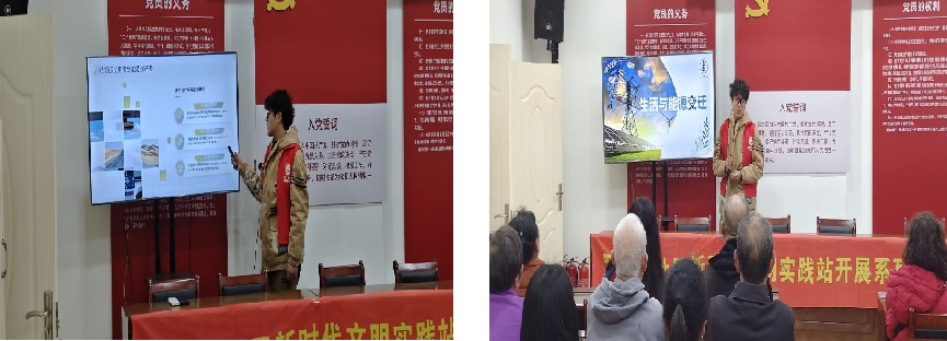 2025年4月9日,betway西汉姆官网黑油能源科普宣讲队的队员前往罗家山社区开展能源科普宣讲活动。主讲人李富淼以身边的新能源为切入点,结合老年人日常场景,用通俗语言介绍光能(太阳能热水器、光伏路灯)、风能(小型风力发电原理)、水能(水力发电与家庭节水)的应用价值,然后结合国家基建,向老人们介绍我国在新能源领域建设的诸多成就和宏伟蓝图,最后以发展新能源的意义作结,引发了老人们的深深共鸣,青年智慧与银发经验碰撞,科技之力与人文关怀交融,这场“青绿对话”为社区可持续发展注入新活力。
