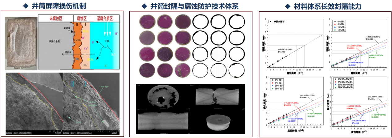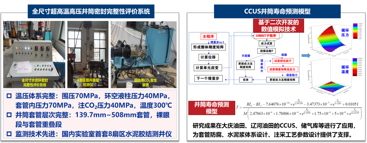 在CCUS井筒完整性保障与长效封隔方向,揭示了多场耦合作用下井筒屏障的动态损伤机理,构建了适应高温、高压及强腐蚀环境的井筒封隔与腐蚀防护技术体系,实现复杂封存井筒的长期有效封固。研发了全尺寸超高温高压井筒密封完整性监测评价系统,形成井筒密封能力监测与评价方法,并建立CCUS井筒寿命预测模型。形成了不留塞压差式微孔承压封堵体系、热固性凝胶封堵体系等井筒密封修复技术,实现二氧化碳封存井筒泄漏的快速修复与完整性重构。