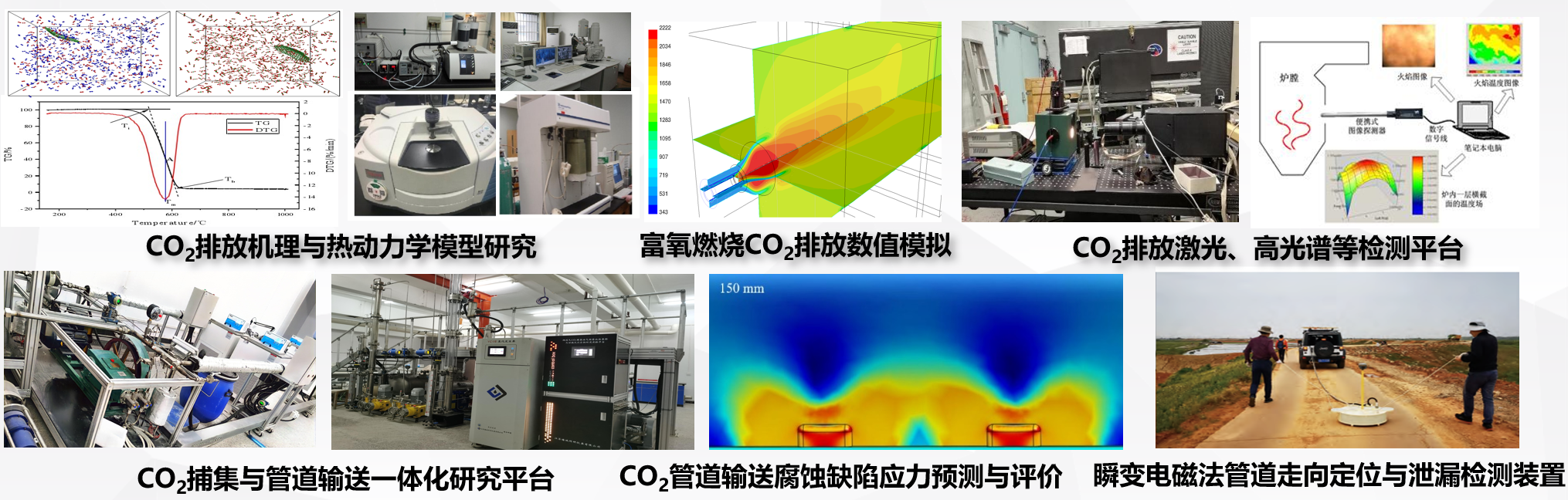 形成了“CO2高效捕集数值模拟与光学检测技术”+“油气管道输送工艺及仿真技术”+“油气管道智能定位、检测与风险评估”三大关键技术,研究了O2/CO2氛围下化石燃料燃烧CO2排放机理模型、结合数值模拟与先进光学检测方法,得到了燃烧过程中流场、温度场、压力场及组分浓度场分布规律,研发了CO2捕集、分离压缩装置与平台。