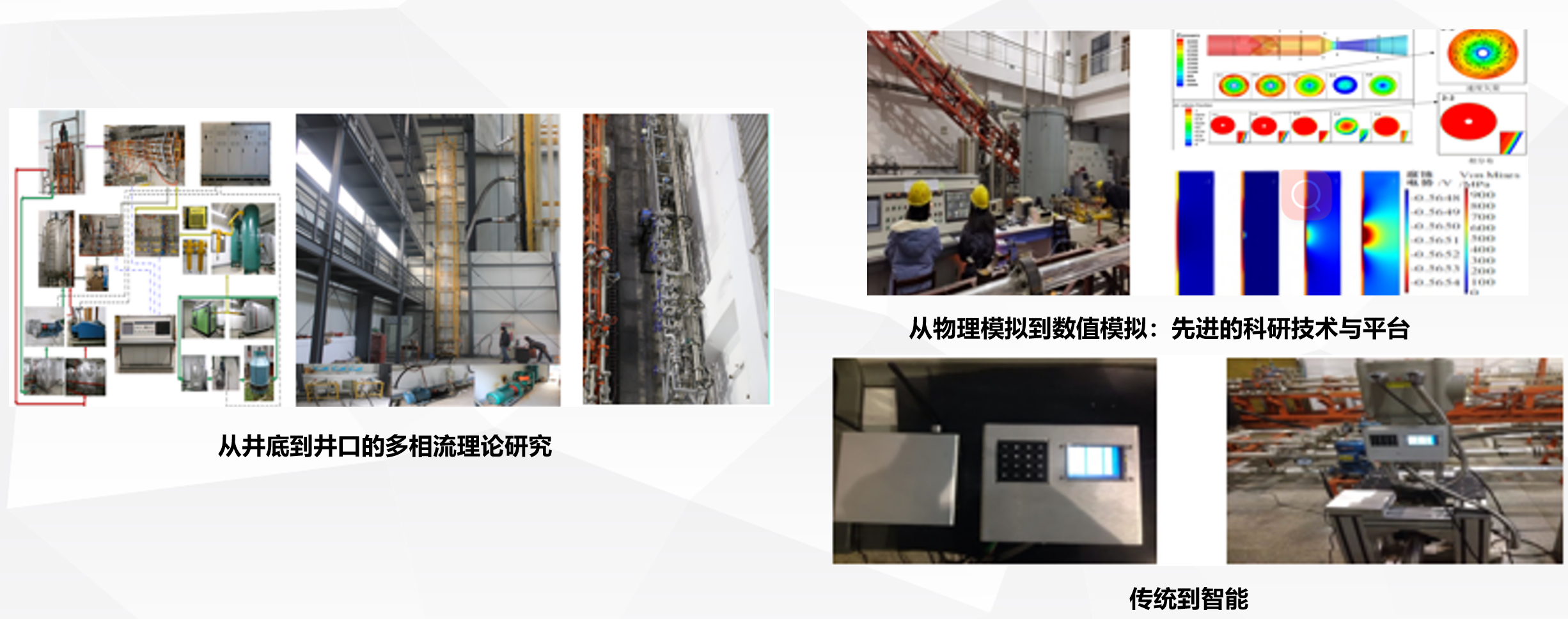 形成了“多相管流与管道腐蚀实验模拟”+“基于物联网全面感知的多相流测量”+“管道智能控制及管网优化”三大关键技术,实现了从井底到井口的多相管流理论研究,从物理模拟到数值模拟的先进科研技术与平台,从传统到智能的生产决策技术。